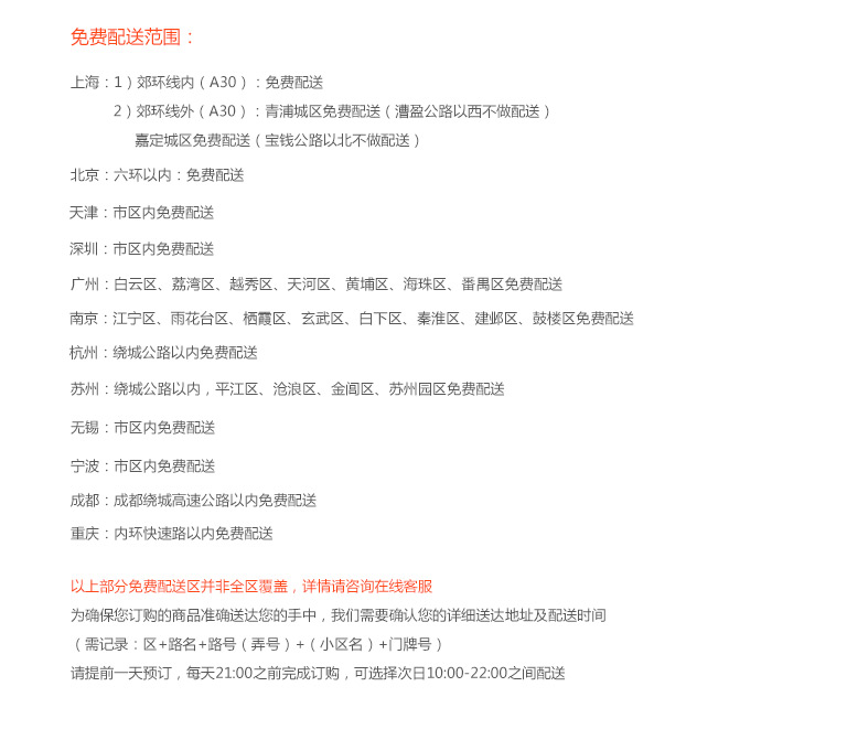 提交订单时您可以选择上午(8:30-12:00)、下午(12:00-18:00)、晚上(18:00-21:00)三个时段;如果对配送时间点有特别需求,您可以选择定时服务。特别提示:如果下单时间距离所选时段少于3小时,您所选时段无法满足的情况下,将尽量在您付款后3小时内送到。